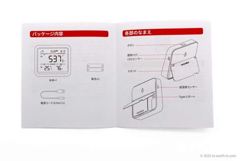 上部ボタン、背面の壁掛け穴、CO₂センサー、温湿度センサー、スタンド、Type-Cポートなど、すべての位置が一目で分かるような図解つき。