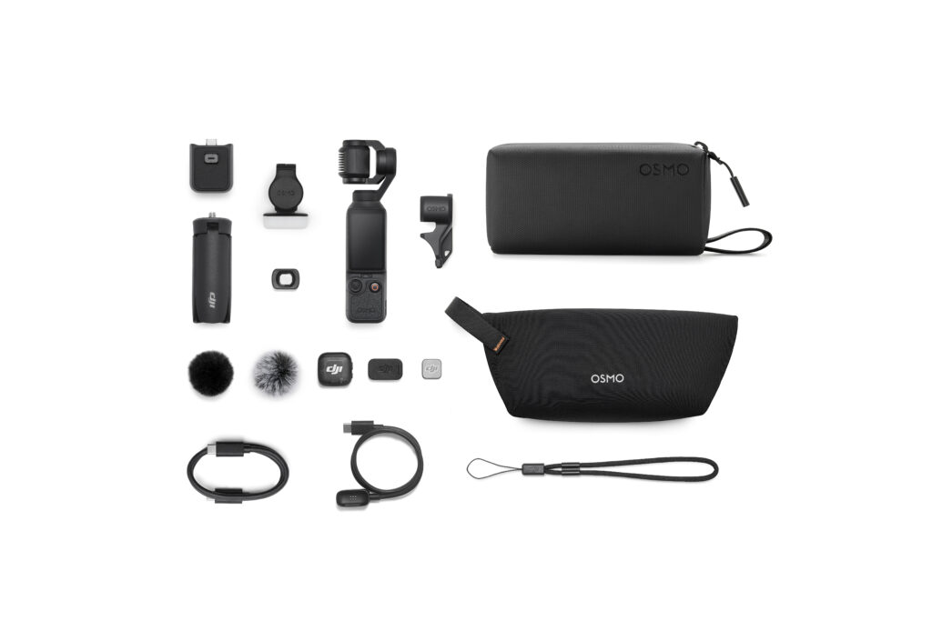 クリエイターコンボは、スタンダードコンボの内容に加えて、広角レンズ、DJI Mic 3トランスミッター、マグネティッククリップ、ウインドスクリーン、マグネット、トランスミッター用充電ケーブル、補助ライト、Osmoミニ三脚、専用キャリーバッグが付属します。